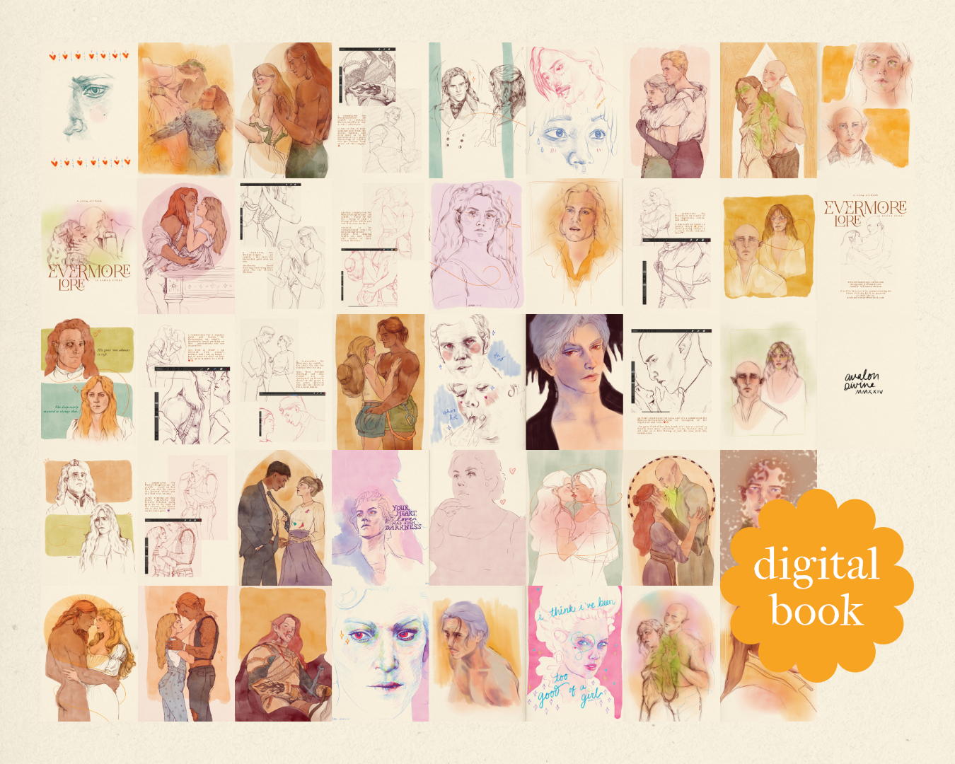 2024, artistically, has been amazing! I managed to draw so much this year, and get commissioned to make amazing pieces for fanfics and fictional couples galore! I'm forever thankful that people enjoy my work so I thought it would be fun and rewarding to make a book of my work! Everything in this pdf is basically my digital sketchbook that is fanart (minus a couple pieces that may have their own book soon 👀) as well as most of my commissions with some wip shots accompanying them.