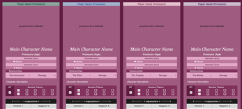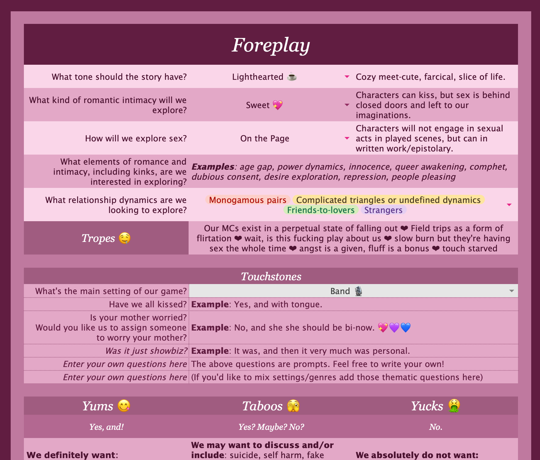 Now, one cannot have pleasure without careful boundary setting and for this we give you: Yums, Taboos, and Yucks, which do as they say on the tin. In additon, we have reframed questions regarding intimacy, hardship, and harm so players may feel their safest in exploring their inner most desires in the upmost safety. Don't forget your paddle and your safeword!