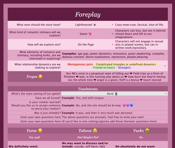 Collaboration has been totally altered, and renamed more aptly: Foreplay, for it is the page that must be undone afore you play. She now contains multitudes of deep questions, perfect for penetrating those pesky world building questions that readers felt... lacking in previous playdocs. Questions like, how will we explore sex? Vigrorously, or perhaps more chastely? An excellent question, and we provide the all the answers you have been fumbling for. Spy the changes in tone, they are short but sweet. Addtionally I have added many a relationship dynamic for you to aspire to, should you want to explore more... non-tradational manners of company.